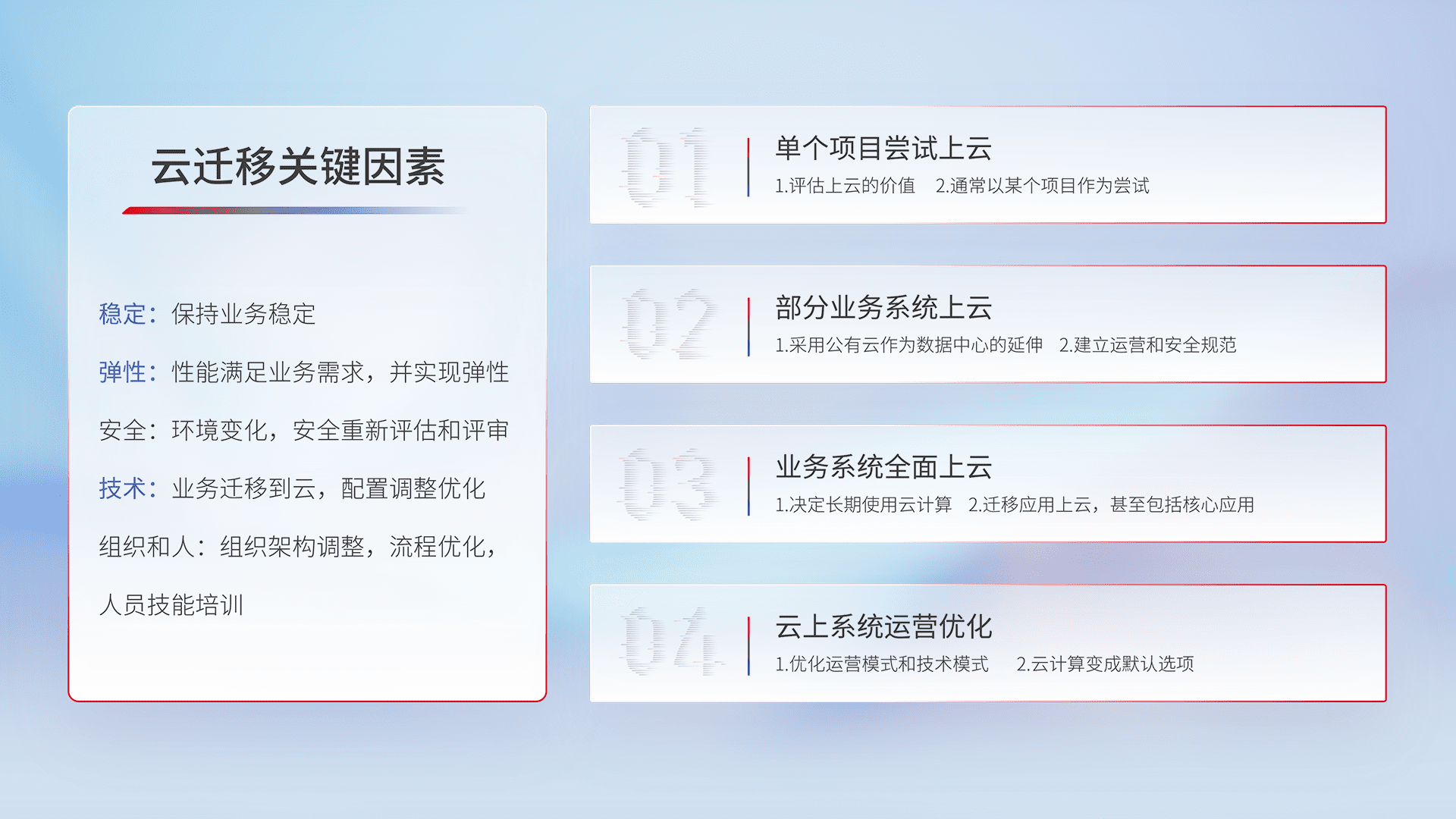 结合实际业务,,从规划设计、、、云平台选型、、云原生改造、、、、数据迁移、、、集成交付,,,,迁移全过程为客户识别最佳上云路径,,,做好风险识别管理,,设计网络架构、、、身份权限、、、安全审计合规、、、操作审计、、、日志审计、、监控告警策略、、多站点容灾设计等,,,,对云上基础设施进行整体规划,,,提升IT治理水平,,,,以满足弹性、、、高可用、、、、高性能的需求。。。