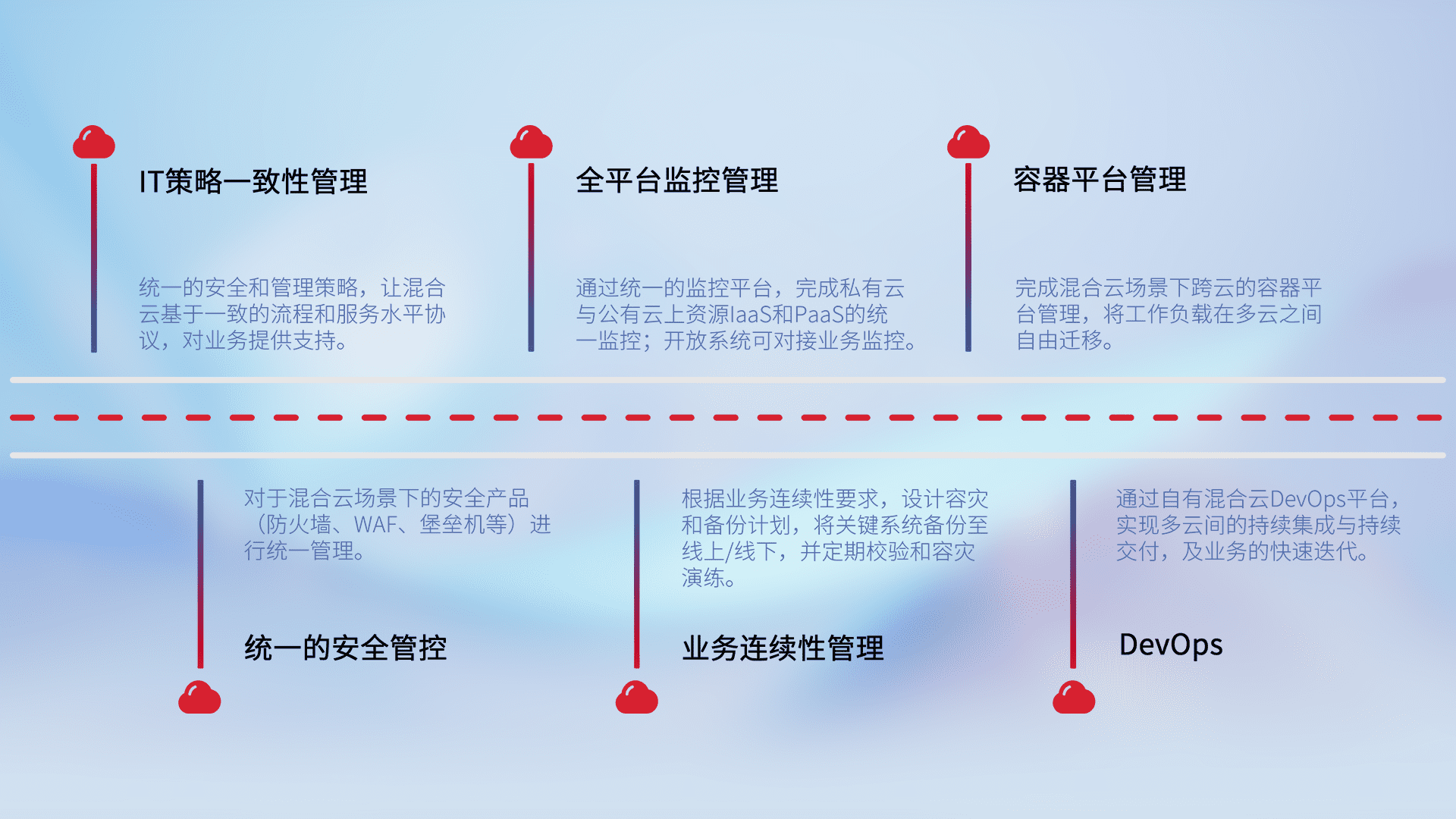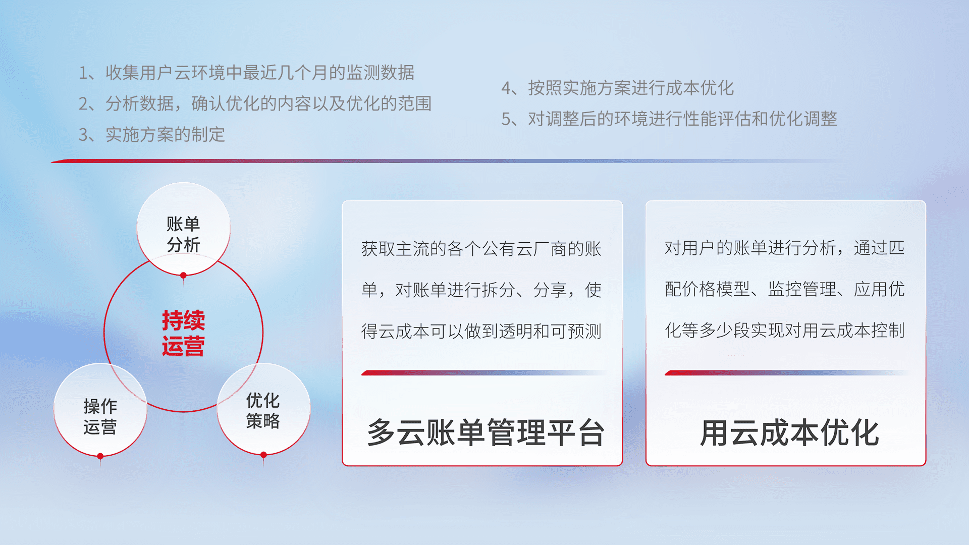 通过多云纳管,,,以统一的资源数据模型把客户的云资源进行抽象和封装,,,进而实现对多云资源的统一操作,,,,保障云资源管理的可靠性、、、、稳定性与可用性。。量身定制化运维内容,,,,配置、、、、开发运维、、补丁管理、、备份、、监控、、认证和访问管理、、审计和日常巡检等,,,保障在用云过程中的可靠度,,,,稳定度以及高可用率。。