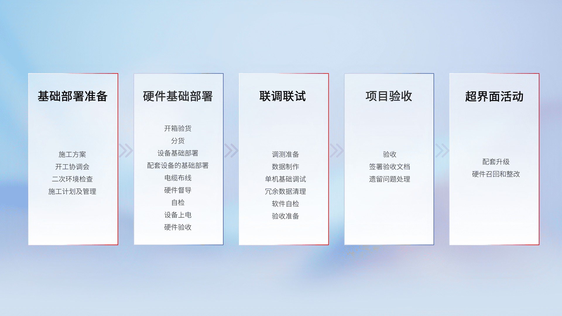 从基础部署准备、、硬件基础部署、、联调联试、、、项目验收、、越界面活动的全过程可追溯,,,,保证施工质量和进度。。